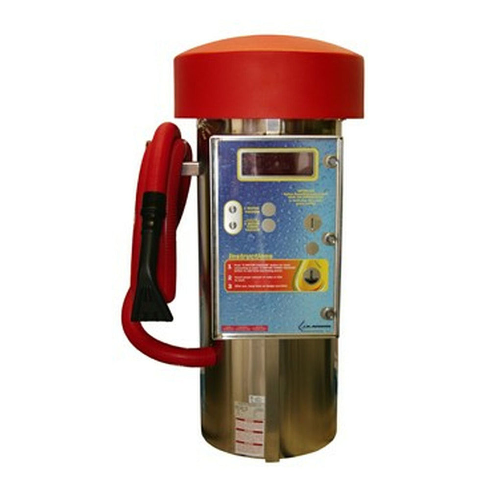 Steel body tank with decals. Round lighted dome available in red, blue, yellow, dark green, purple and white. 2 lighted push buttons for the following functions: 2 motor vacuum, 3 motor turbo vacuum. Large Dixmor digital display timer scrolls messages, calculates time between functions, recalculates remaining time when switched during any function, and has a built-in coin counter. Visual and audible last coin alarm. The coin box holds 800 quarters or $200.00. Mars bill acceptor takes $1.00 and $5.00 bills. Imonex electronic coin acceptor takes U.S. $1.00 coins, U.S. quarters, 1.073 and 0.984 tokens. Comes with 4 Medeco plug locks. Black 15' x 2'' hose, swivel cuff, and nozzle included. 15' x 2'' hose available in red, blue, yellow and green at no additional charge.