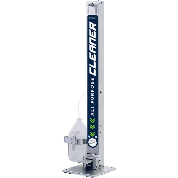 The DCCD Detail Center Cleaner Dispenser minimizes shrinkage from spray bottle use by drawing liquids or gels directly from bulk containers, reducing costs. It features an adjustable dispensing range of 2,800 to 8,400 dispenses per gallon for precise application. Built for durability, it includes a machined stainless steel pump, a stainless steel housing, base, and foot pedal, along with a chemical pickup tube and strainer for efficient operation.
